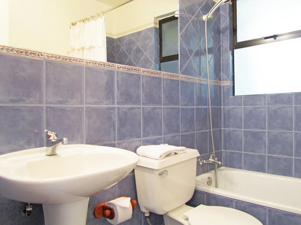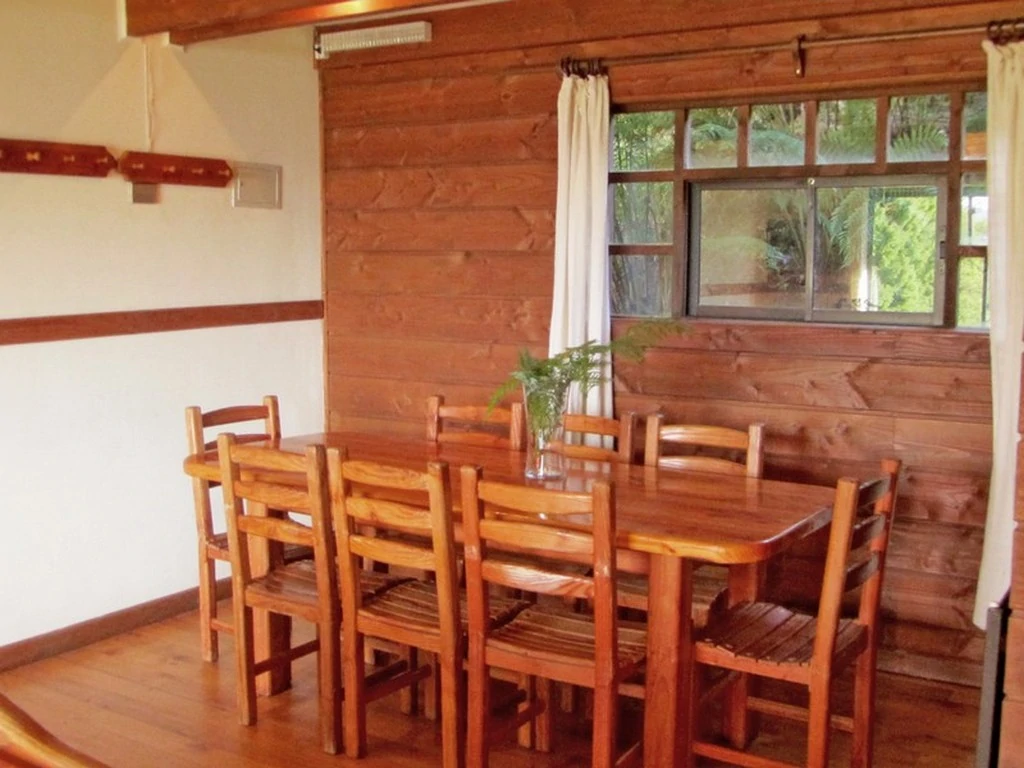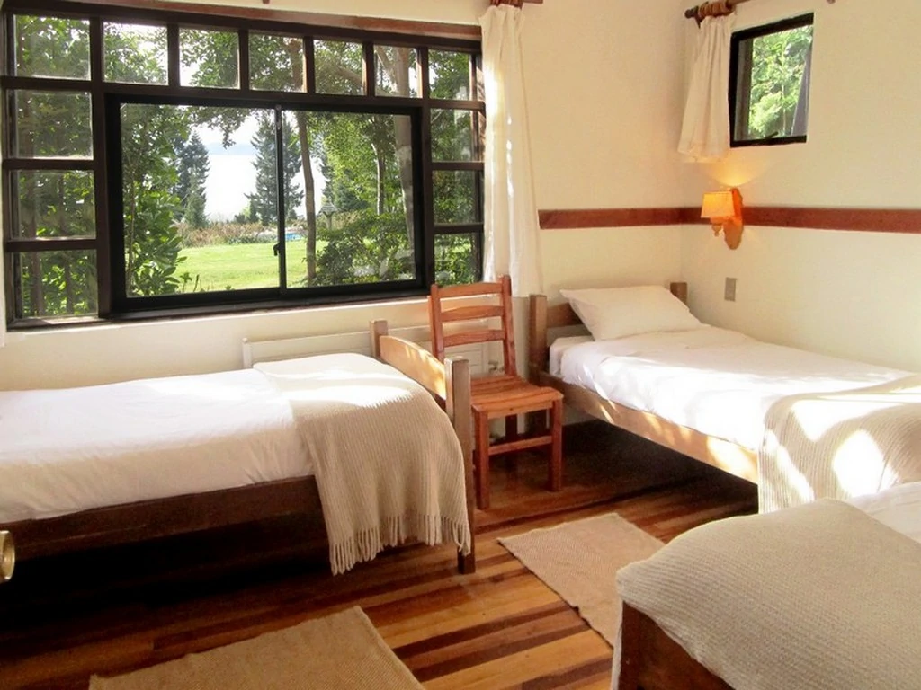 Cabaña tipo departamento (1 planta, sobre ella está la cabaña de 5 personas) con una habitación matrimonial cama king y baño en suite, una habitación con 3 camas de 1 plaza, y la tercera habitación con un camarote y una cama. Otro baño. Living-comedor con Chimenea, cocina, terraza, calefacción central por radiadores y baños con loza radiante